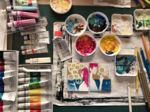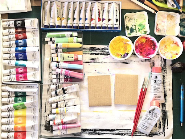 すぐに素材を準備して、テーブルいっぱいに画材も並べて