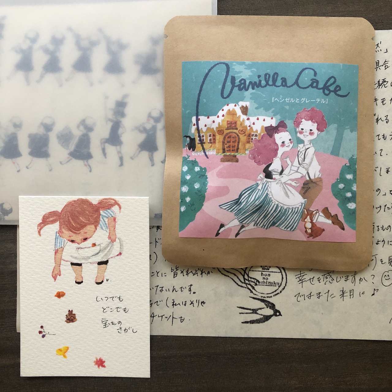 原画プチカードとお手紙、イラストパッケージコーヒーは「ヘンゼルとグレーテル」です。